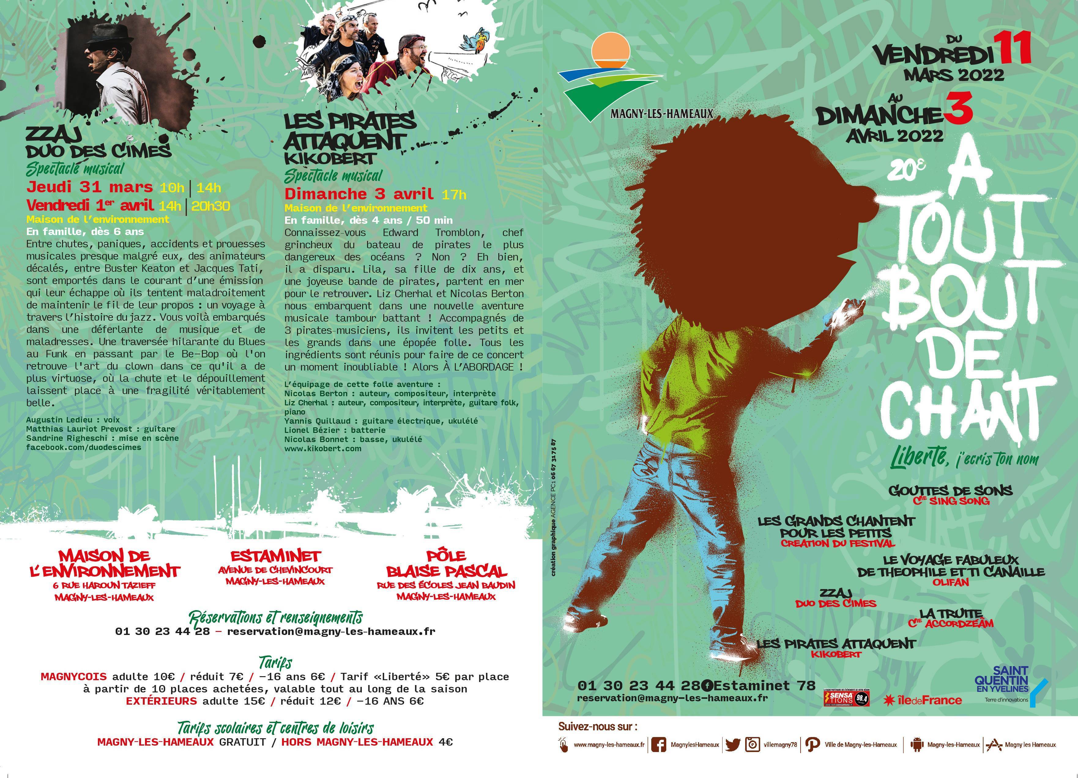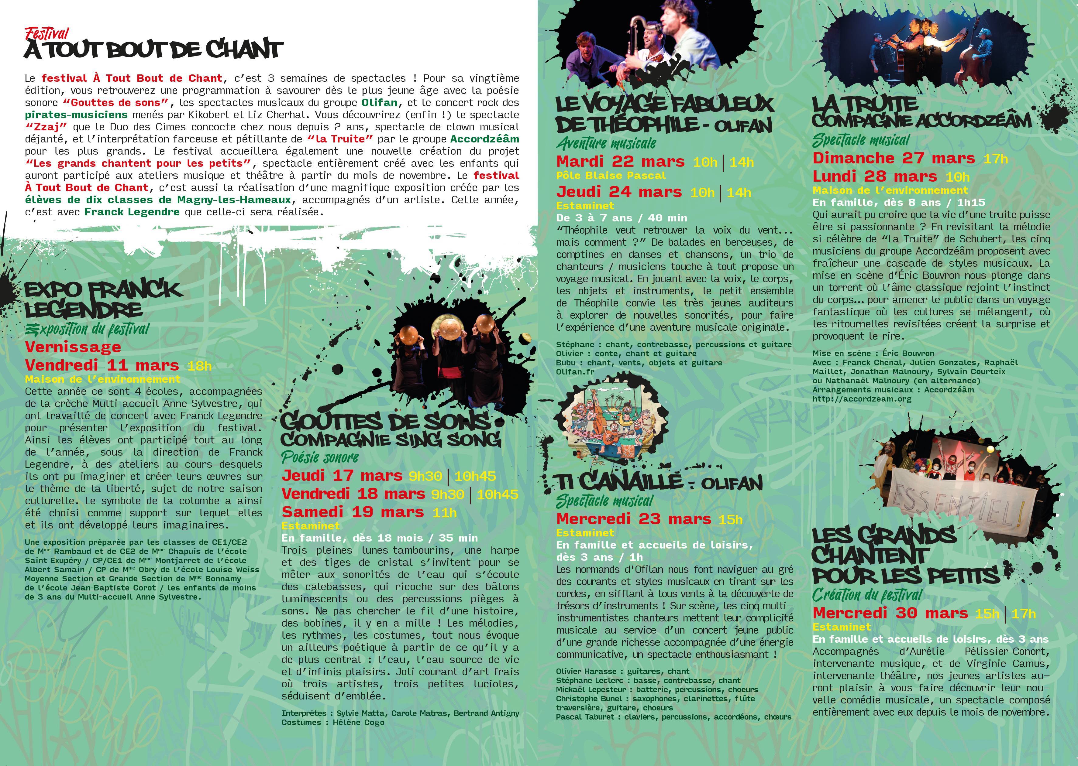 Le festival A Tout Bout de Chant, c’est 3 semaines de spectacles ! Pour sa vingtième édition, vous retrouverez une programmation à savourer dès le plus jeune âge avec la poésie sonore “Gouttes de sons”, les spectacles musicaux du groupe Olifan, et le concert rock des pirates-musiciens menés par Kikobert et Liz Cherhal. Vous découvrirez (enfin !) le spectacle “Zzaj” que le Duo des Cimes concocte chez nous depuis 2 ans, spectacle de clown musical déjanté, et l’interprétation farceuse et pétillante de “la Truite” par le groupe Accordzéâm pour les plus grands.