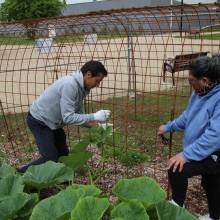 RDV, de nouveau, avec Arthur, samedi 28 juin au matin pour accrochage de courges et tomates sur les structures. Ça pousse fort avec ce temps changeant, et la nature s’emballe depuis la plantation du 26 avril !